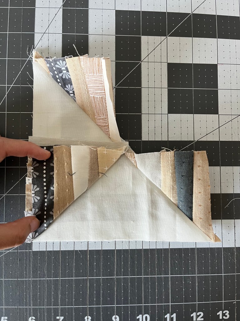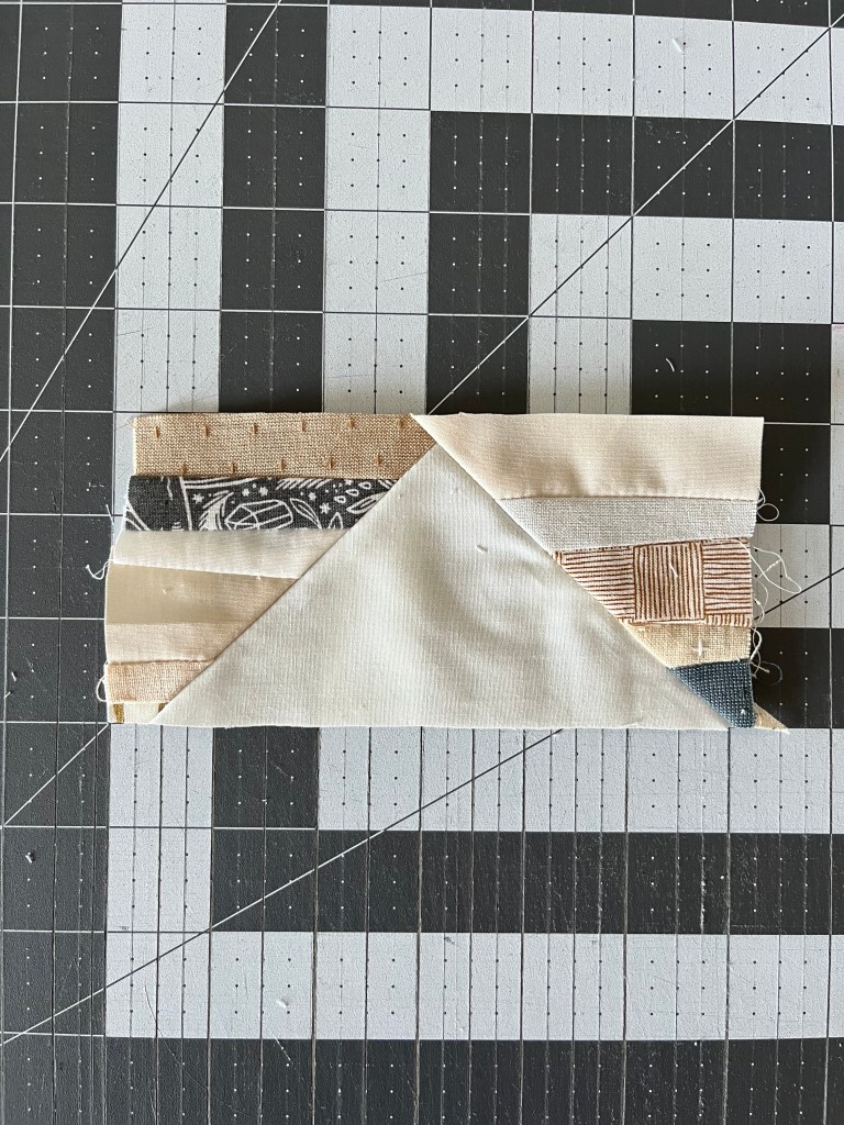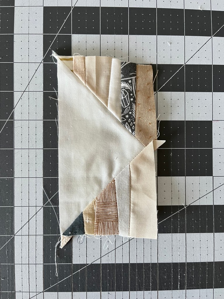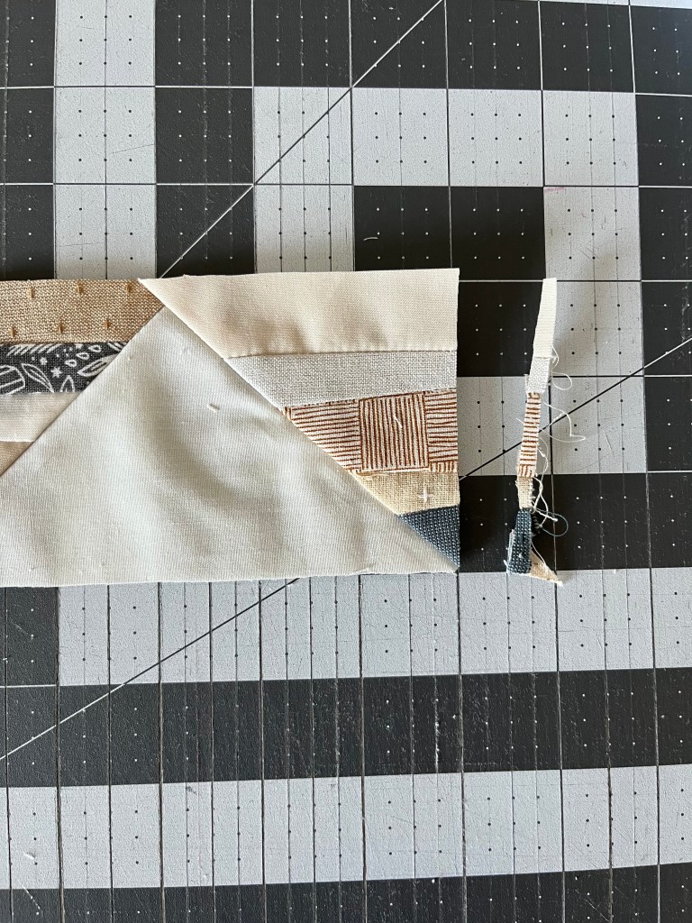 Step 6: Mark a guideline from corner to corner on the 3.75″ square, sew 1/4″ seam on both sides. Cut along the guideline, and press the seam to the darker fabric.