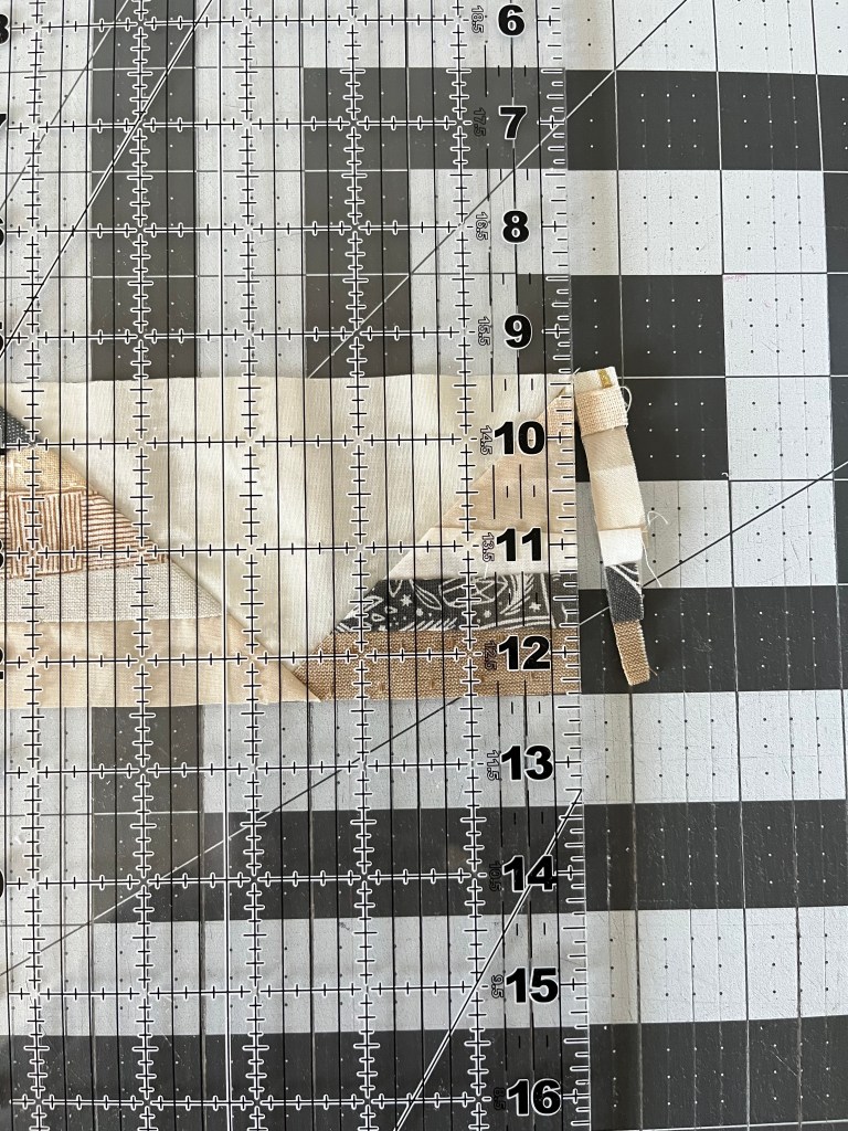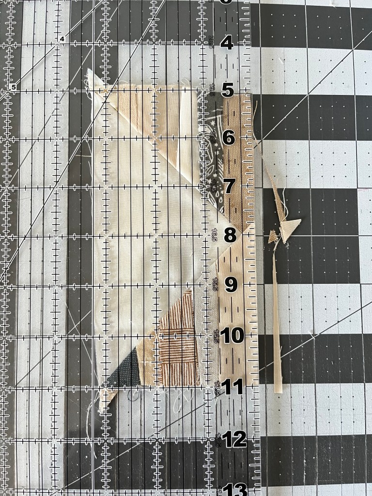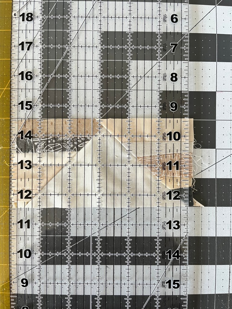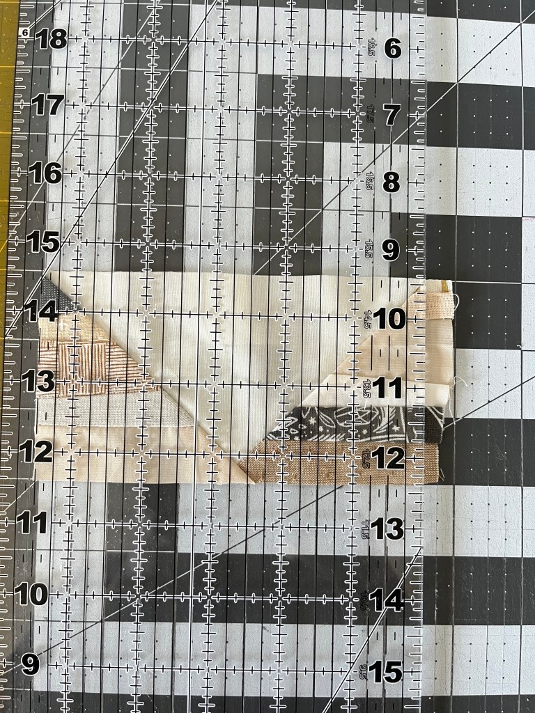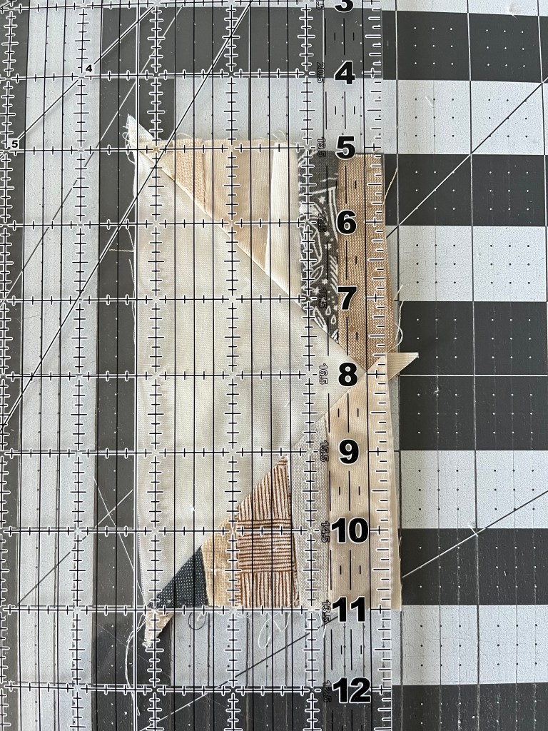 Step 5: Flip the block so the point is facing down. Line the ruler up with the background point on the top right. The block should measure 5.5″ from left to right. Trim.