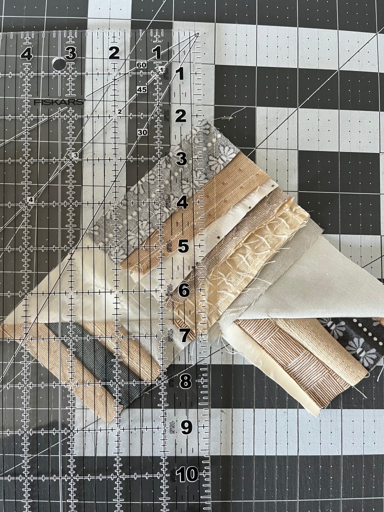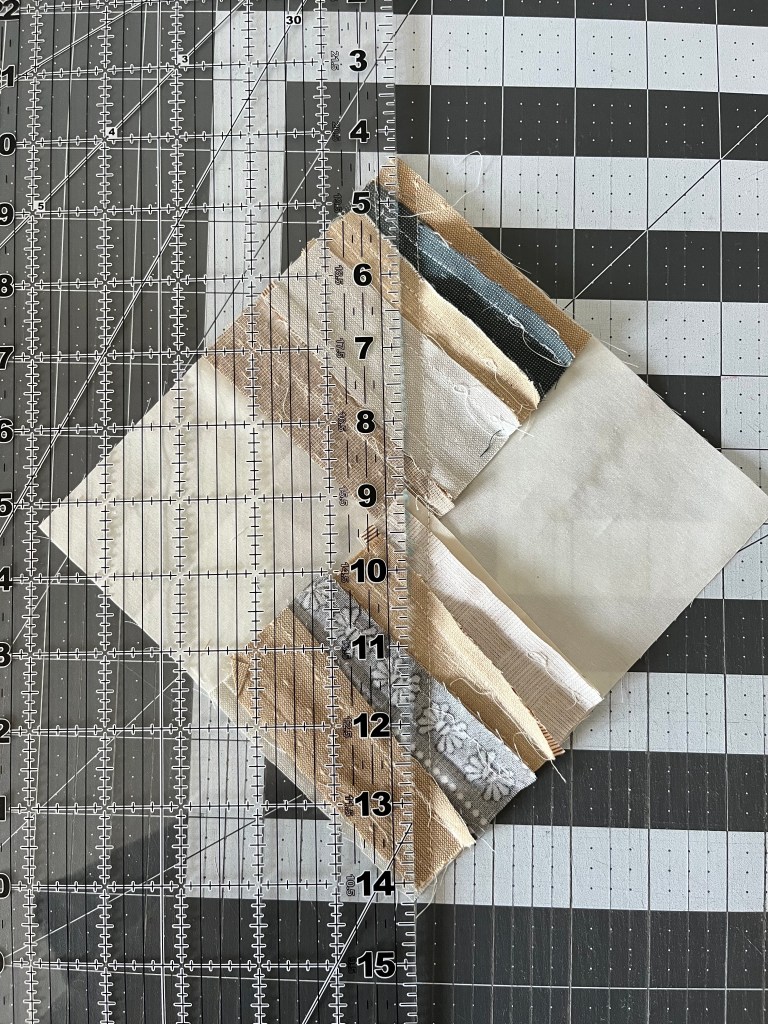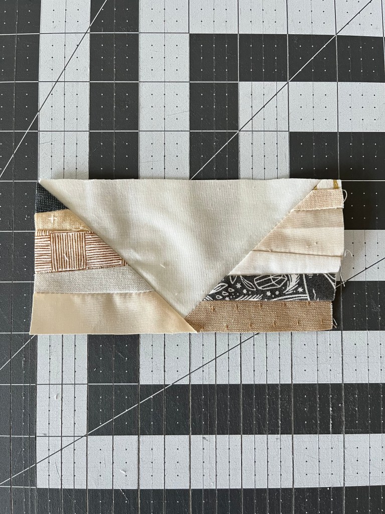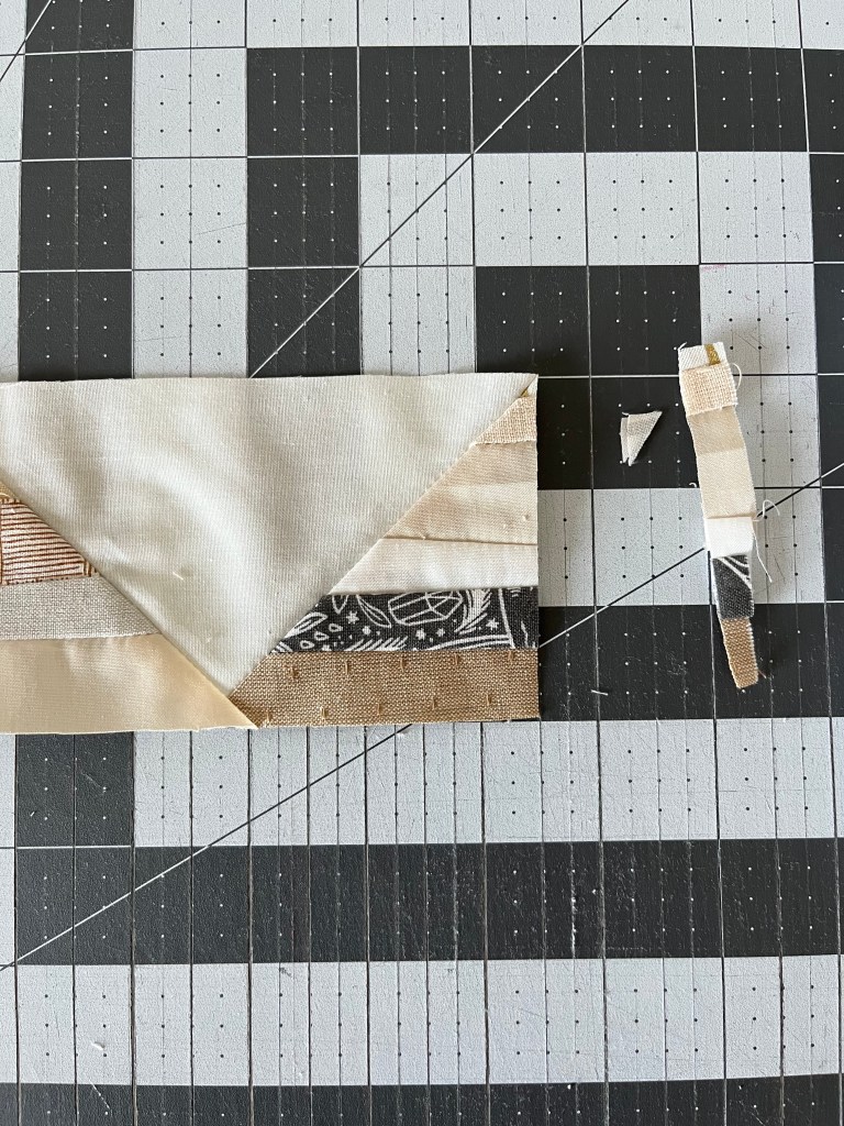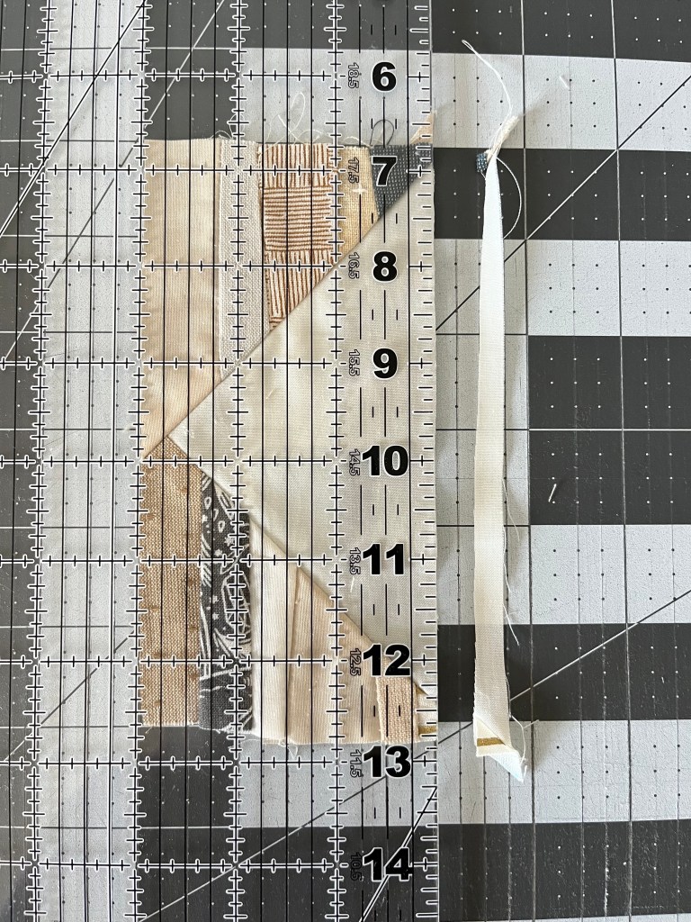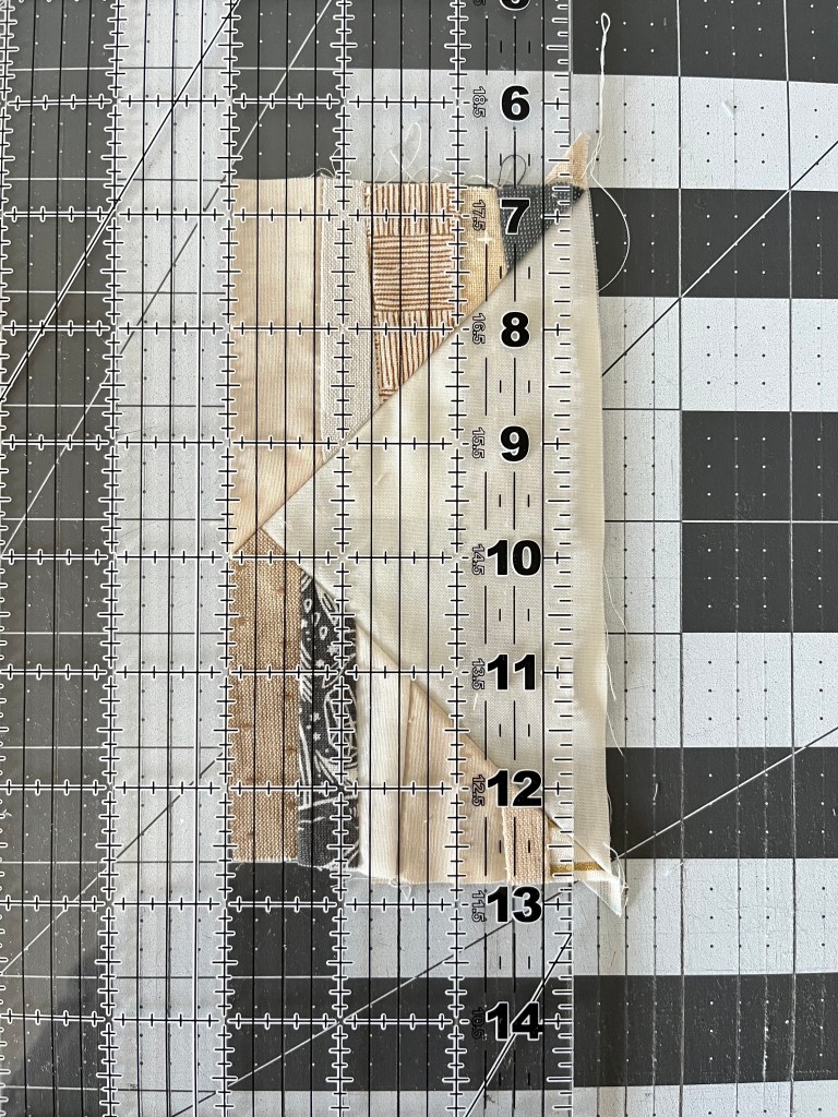 Step 5: Flip the block so the point is facing down. Line the ruler up with the background point on the top right. The block should measure 5.5″ from left to right. Trim.