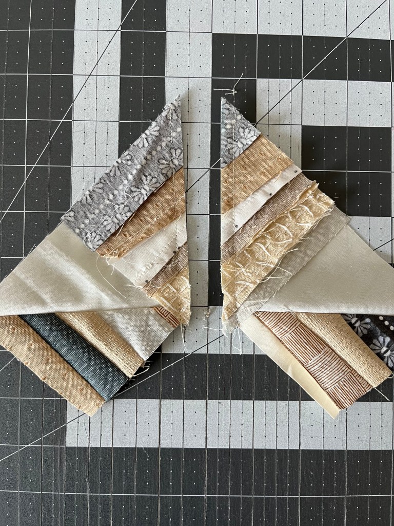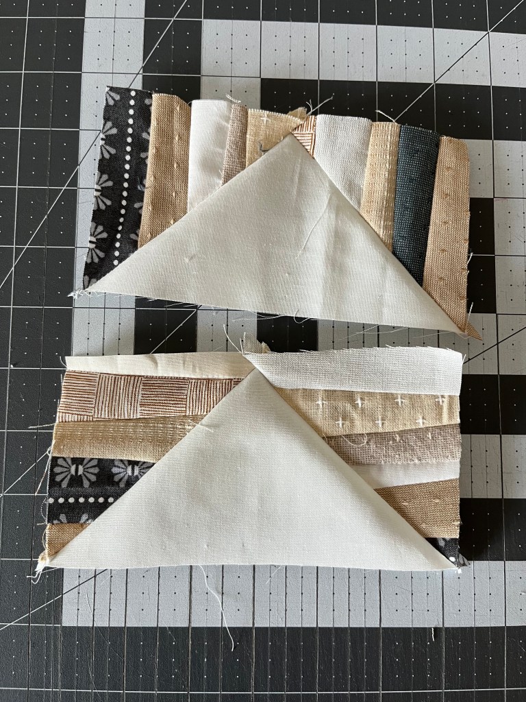 Repeat with all of the 7″ background squares and 3.75″ improv strip squares. There should be 4 flying geese units per block.