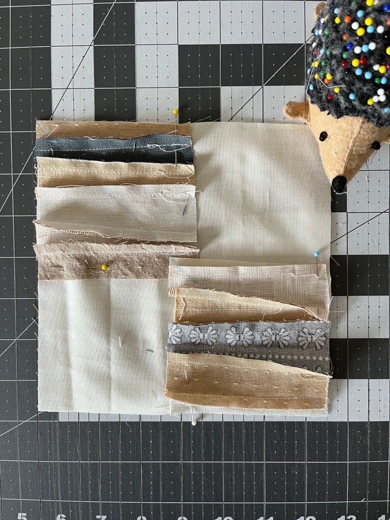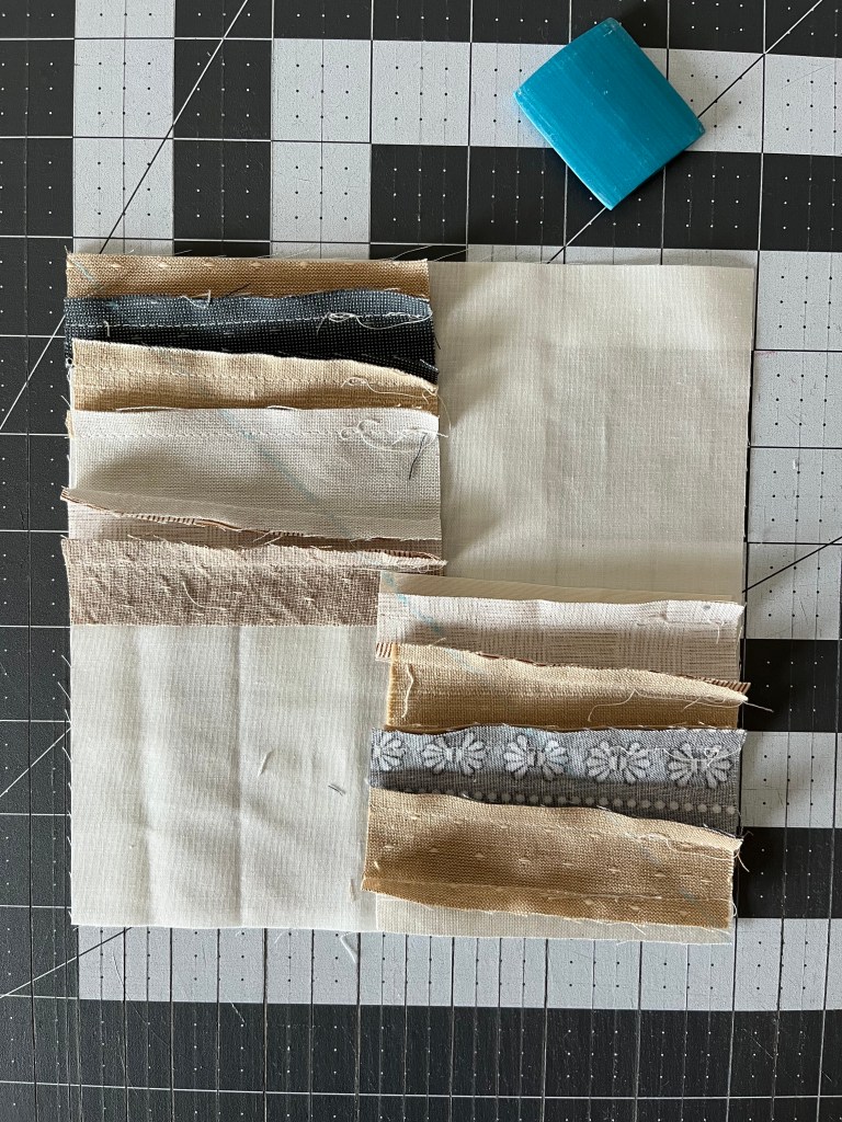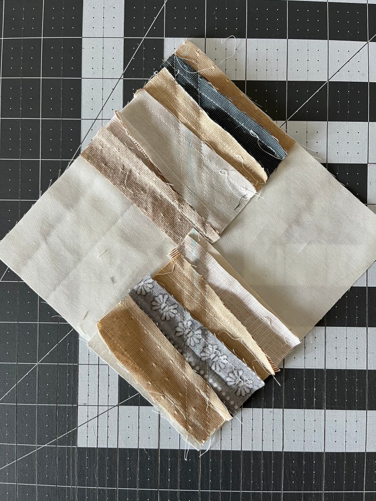 Step 1: Place two 3.75″ strip units onto a 7″ background square, as shown below. We want the strips to all lay in the same direction, so make sure to arrange them correctly. I like to place both of them horizontally.