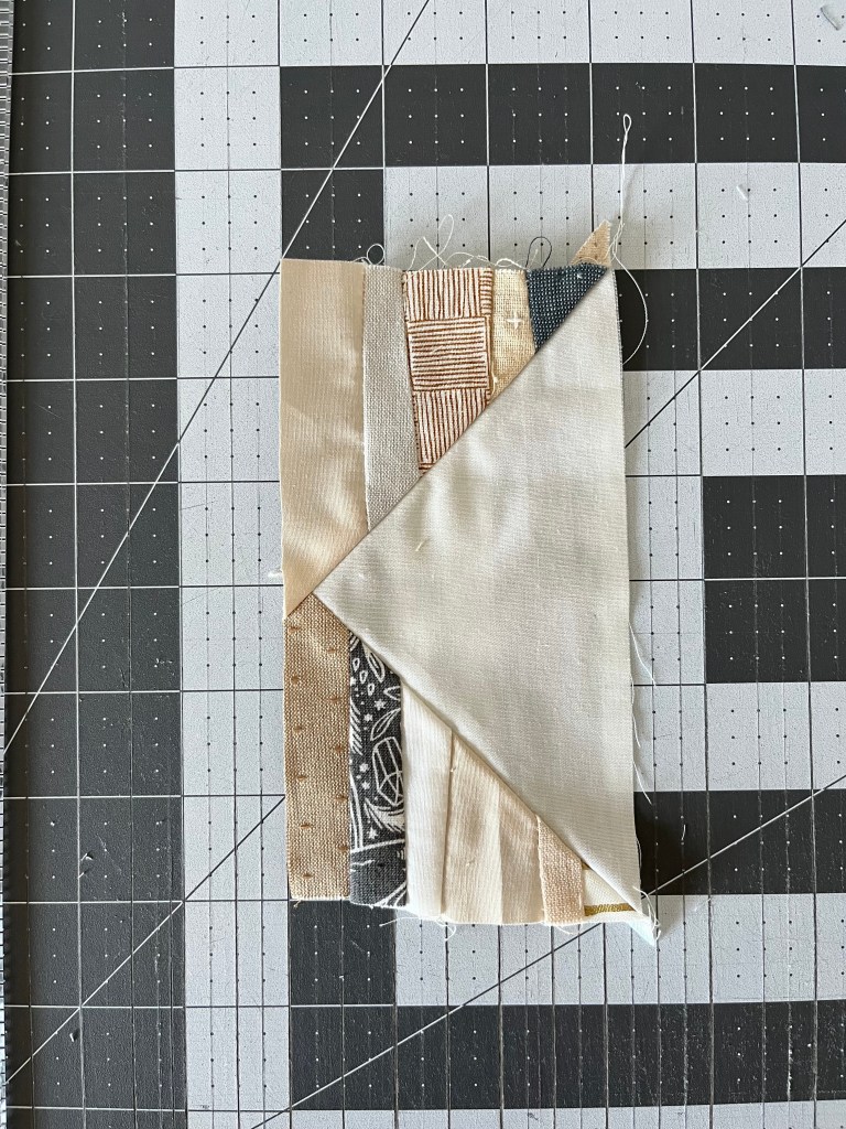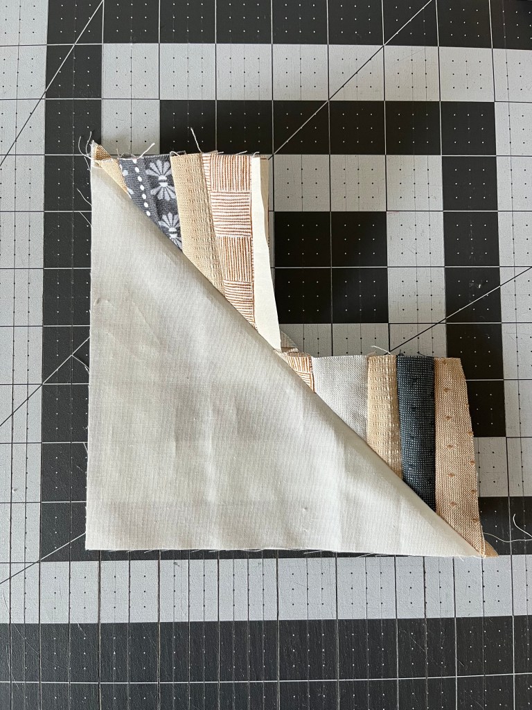 Step 5: Place another 3.75″ square in the corner of the cut unit, as shown below. I like to fold it back to make sure the strips are facing the right way before marking, sewing, and cutting.